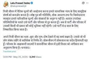 लालू प्रसाद यादव ने अपने आधिकारिक सोशल मीडिया अकाउंट से एक बयान जारी करते हुए कहा, “निजी जीवन में नैतिक मूल्यों की अवहेलना करना हमारे सामाजिक न्याय के लिए चल रहे सामूहिक संघर्ष को कमजोर करता है।” उन्होंने आगे लिखा, “ज्येष्ठ पुत्र की गतिविधि, लोक आचरण तथा गैर जिम्मेदाराना व्यवहार हमारे पारिवारिक मूल्यों और संस्कारों के अनुरूप नहीं है। अतएव उपरोक्त परिस्थितियों के चलते उसे पार्टी और परिवार से दूर करता हूँ।”